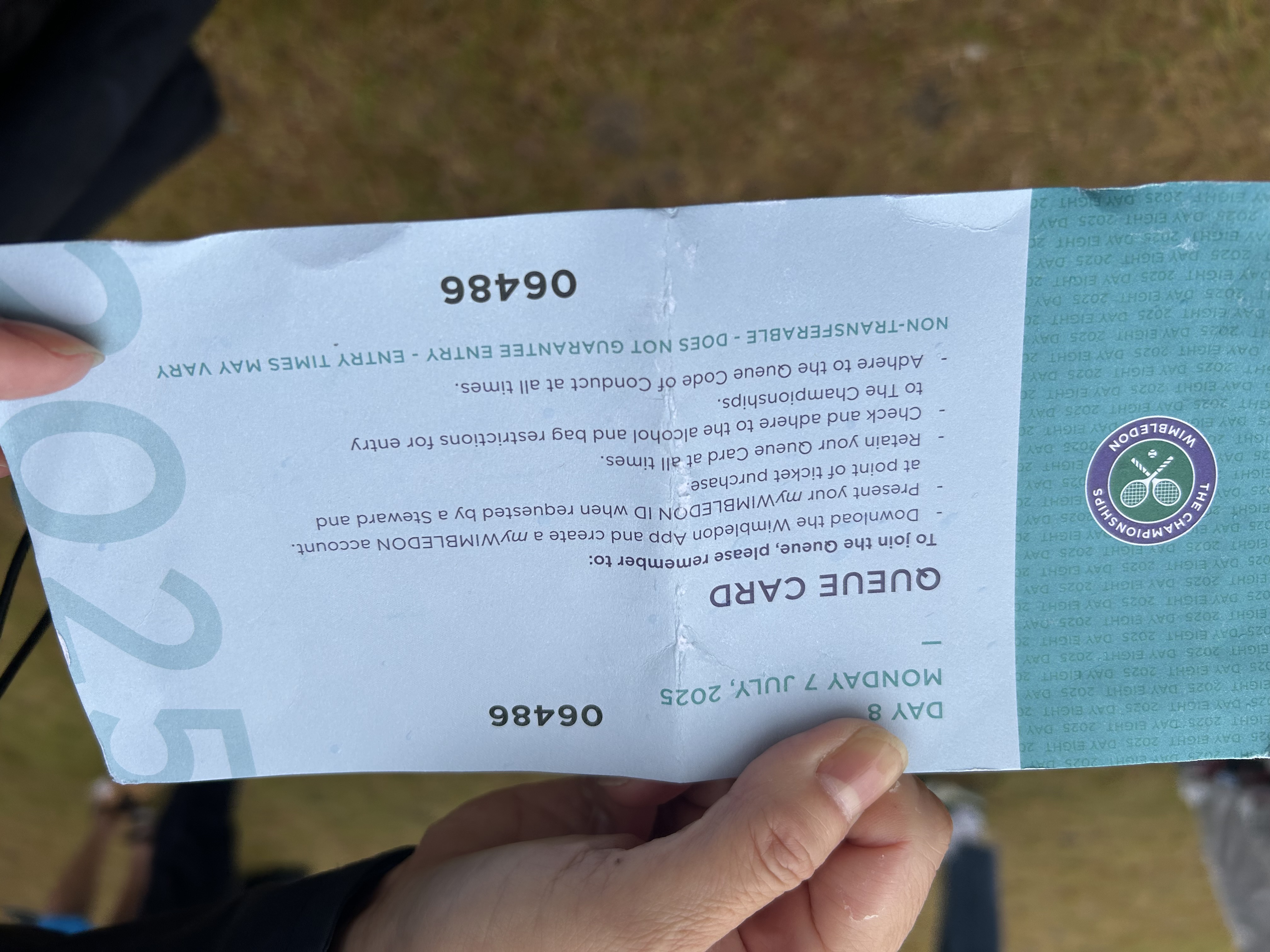 - 当日券はトータルで1万〜1万1千枚程度配られるので、自分がもらった番号がそれより大きな数字なら、残念ながら諦めた方が良いでしょう。微妙な番号の場合、最終的に入れるかもしれませんが、午後3,4時以降、時には夕方になることを覚悟しておいたほうがよいでしょう。ウィンブルドンは基本的に日没まで試合をしますので、試合数の多い1週目の前半ならそれでも何試合か見られます。