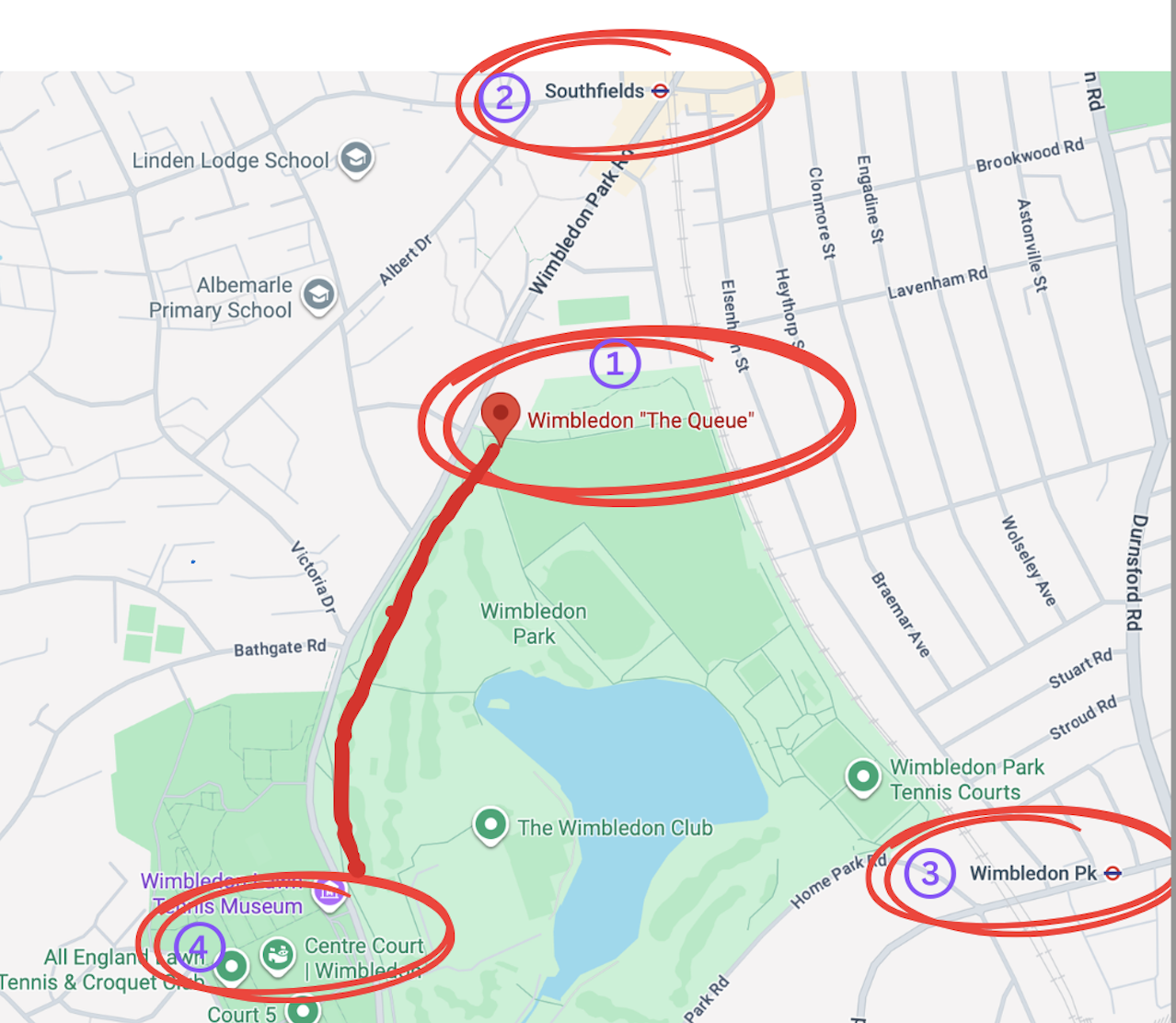 場所と行き方:この地図の①にあるように、google mapで the queue, wimbledonと入力すれば場所が出てきます。